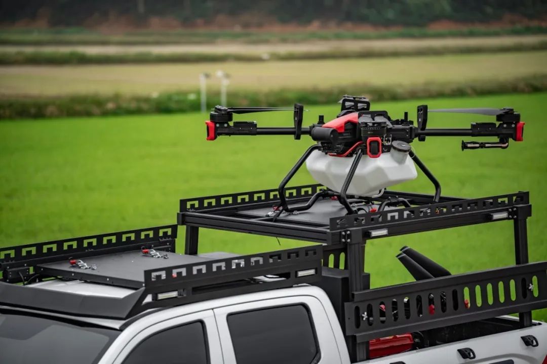 金剛炮新農(nóng)人版一次性提供完整的模塊化箱體、以及車頂無人機平臺,可以同時裝載兩架植保無人機,單日能完成近千畝農(nóng)田的植保作業(yè)。無人機載物架整體采用鋼材結構,堅固耐用,承載力更強。